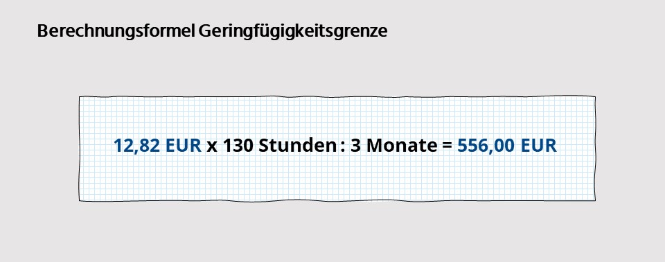 Die Geringfügigkeitsgrenze erhöht sich aufgrund der Anhebung des Mindestlohns zum 1. Januar 2025 auf 12,82 EUR brutto je Zeitstunde auf 556 EUR im Monat bzw. auf das Zwölffache (6.672 EUR) bei durchgehender mindestens zwölf Monate dauernder Beschäftigung gegen Arbeitsentgelt in jedem Monat. Hinsichtlich des gelegentlichen unvorhersehbaren Überschreitens gilt das Vierzehnfache (7.784 EUR).