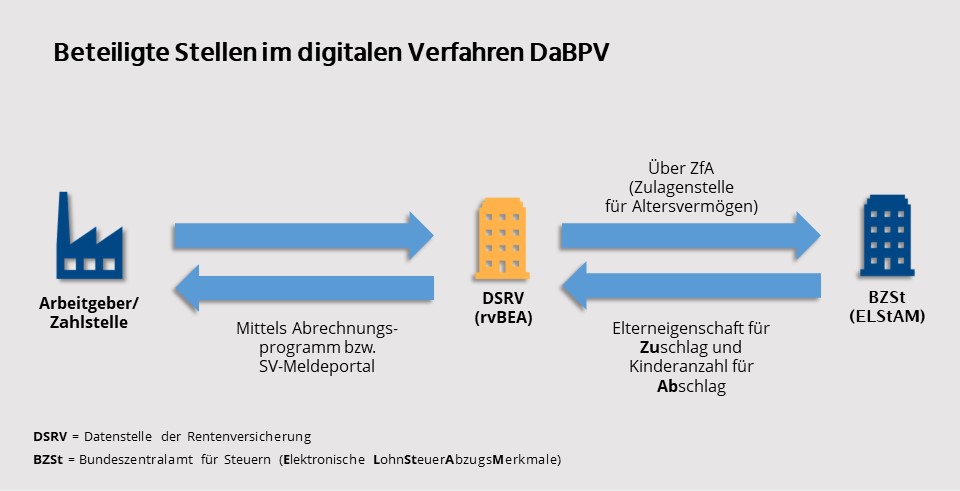 Das Bundeszentralamt für Steuern (BZSt), der Spitzenverband Bund der Pflegekassen und die Deutsche Rentenversicherung Bund haben die Gemeinsamen Grundsätze vom 29. August 2024 aufgestellt. Danach gilt (Ziffer 1.2): „Die Teilnahme am DaBPV ist für alle beitragsabführenden Stellen, die zur Berücksichtigung von Zu- und Abschlägen in der sozialen Pflegeversicherung verpflichtet sind, obligatorisch.“ Die Gemeinsamen Grundsätze (sowie nach deren Finalisierung später auch die von der ZfA aufzustellende Verfahrensbeschreibung) können wertvolle Unterstützung beim Start in das neue Verfahren leisten.