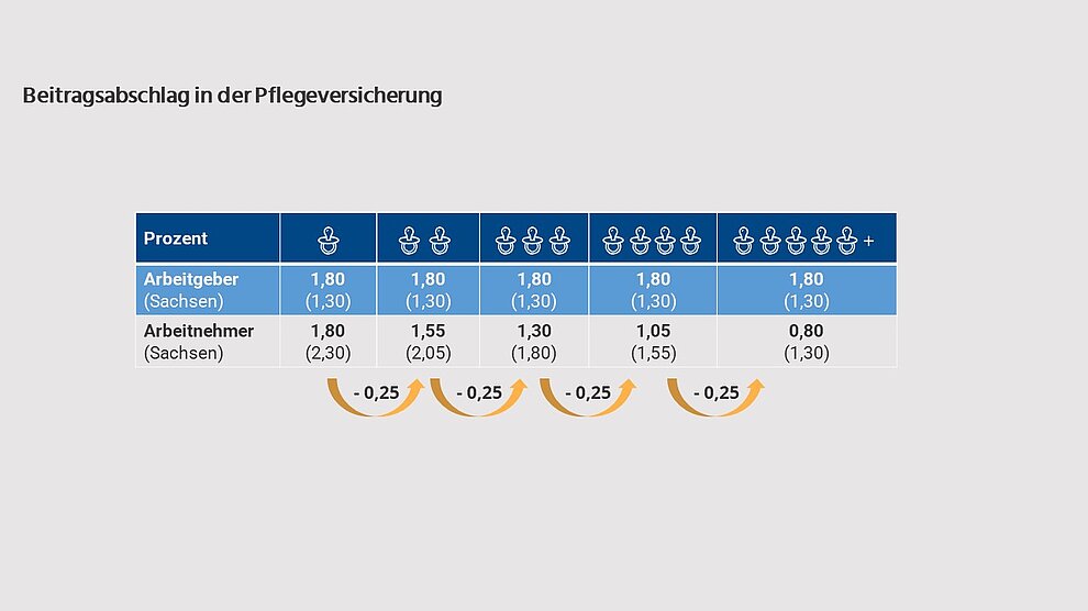 Für Arbeitnehmer mit Elterneigenschaft reduziert sich der Beitragssatz zur Pflegeversicherung für jedes berücksichtigungsfähige Kind ab dem zweiten Kind bis zum fünften Kind um jeweils einen Beitragsabschlag in Höhe von 0,25 Beitragssatzpunkten: