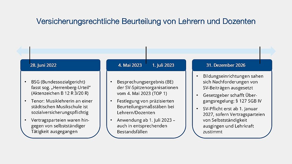 Nach der Übergangsregelung in § 127 SGB IV soll eine Feststellung des Sozialversicherungsstatus von Lehrkräften als abhängig beschäftigt durch die Sozialversicherungsträger bis zum 31. Dezember 2026 ohne Wirkung bleiben; d. h. die Versicherungspflicht soll erst ab dem 1. Januar 2027 beginnen. Dies gilt immer dann, wenn