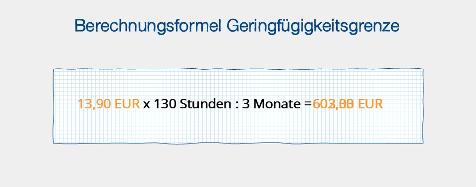 Berechnung: Als dynamische Obergrenze für einen Minijob orientiert sich die Geringfügigkeitsgrenze an einer Wochenarbeitszeit von 10 Stunden zum gesetzlichen Mindestlohn. Der gesetzliche Mindest-Stundenlohn wird mit 130 Stunden (13 Wochen pro Quartal multipliziert mit 10 Stunden) vervielfacht, durch 3 Monate geteilt und der sich daraus ergebende Betrag wird auf volle Euro aufgerundet. Eine wöchentliche Arbeitszeit von 10 Stunden entspricht einer Arbeitszeit von 43 Stunden und 20 Minuten im Monat.