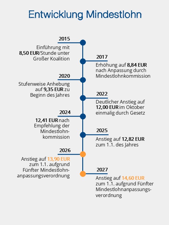 Die Mindestlohnkommission hat alle zwei Jahre über eine Anpassung der Höhe des gesetzlichen Mindestlohns zu beschließen (§ 9 Abs. 1 MiLoG) – heißt also bis zum 30. Juni 2025 für die Jahre 2026 und 2027. Am 27. Juni 2025 erfolgte der fünfte Beschluss mit einer Erhöhung in zwei Stufen (jeweils brutto je Zeitstunde):
